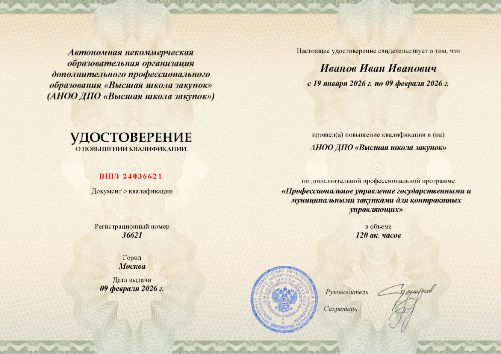 Вы получаете официальное удостоверение о повышении квалификации. Высшая школа закупок (fz44.org) обеспечивает передачу данных в реестр ФИС ФРДО, подтверждая соответствие вашей подготовки в Рязани требованиям Минтруда.